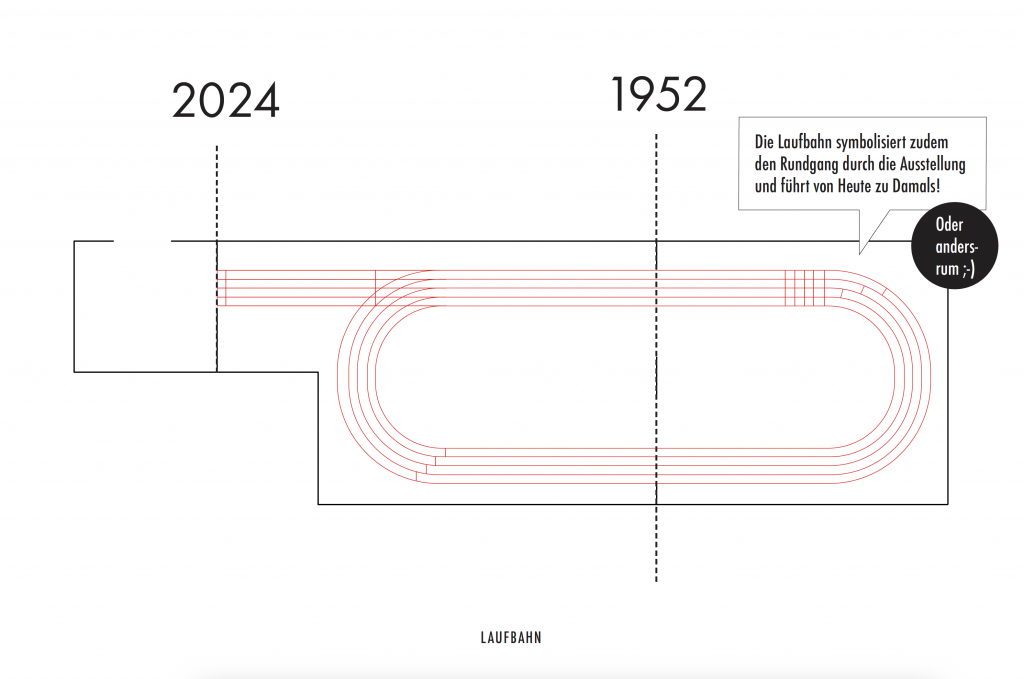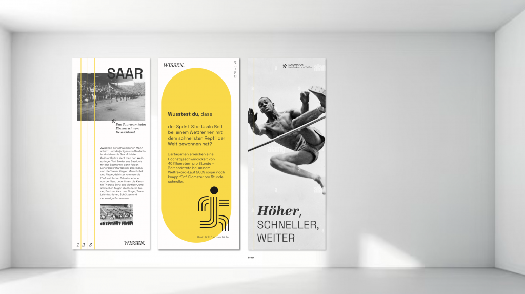 Für die Ausstellung „Die Spiele können beginnen“ im KuBa Saarbrücken reichte unsere Gestaltung vom Plakat bis zur Raumausstattung: Sprungwand, Hürdenlaufstation, Informationsbereiche und die Präsentation originaler Objekte der Olympischen Spiele 1952 in Helsinki.