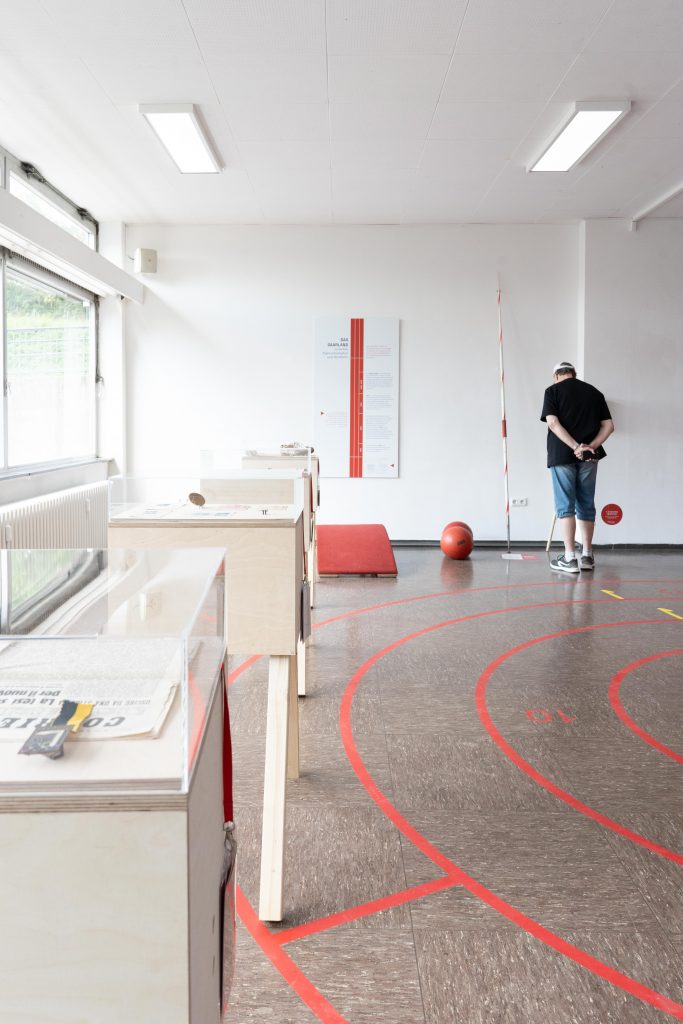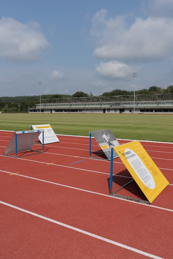 Viele Ausstellungselemente entstanden durch die Weiterverwendung vorhandener Sportgeräte. Ermöglicht wurde dies durch Leihgaben des Olympiastützpunktes sowie regionaler Sportvereine. Eingesetzt wurden unter anderem Tennisschiedsrichterstühle, Sprungböcke, Laufhürden, Mattenwagen und Medizinbälle – Dinge aus dem Trainingsalltag, die im Ausstellungsraum eine neue Funktion erhielten.